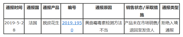據(jù)歐盟食品飼料類快速預(yù)警系統(tǒng)(RASFF)消息,2019年5月28日,法國通過RASFF通報我國出口花生不合格。