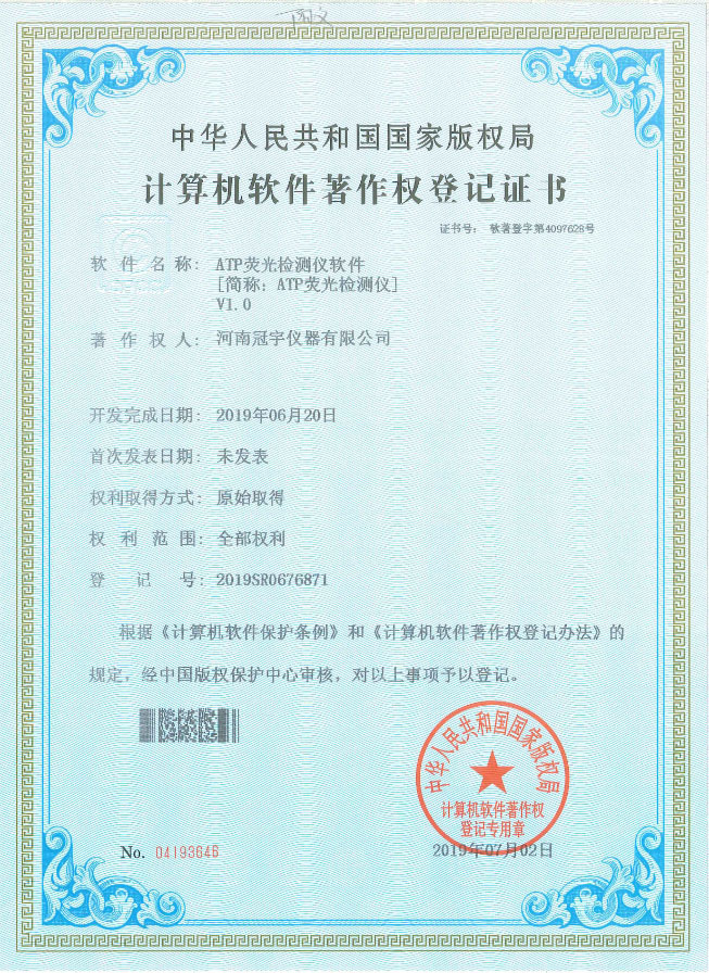 近日,河南冠宇儀器有限公司(以下簡稱:冠宇儀器)繼之前的多項軟件著作權(quán)證書及專利證書之后,又獲由中華人民共和國國家版權(quán)局頒發(fā)的一項“ATP熒光檢測儀計算機軟件著作權(quán)登記證書”,一系列的權(quán)威肯定,彰顯了冠宇儀器強大的技術(shù)研發(fā)能力,也體現(xiàn)出公司為客戶提供優(yōu)質(zhì)產(chǎn)品的強大決心。