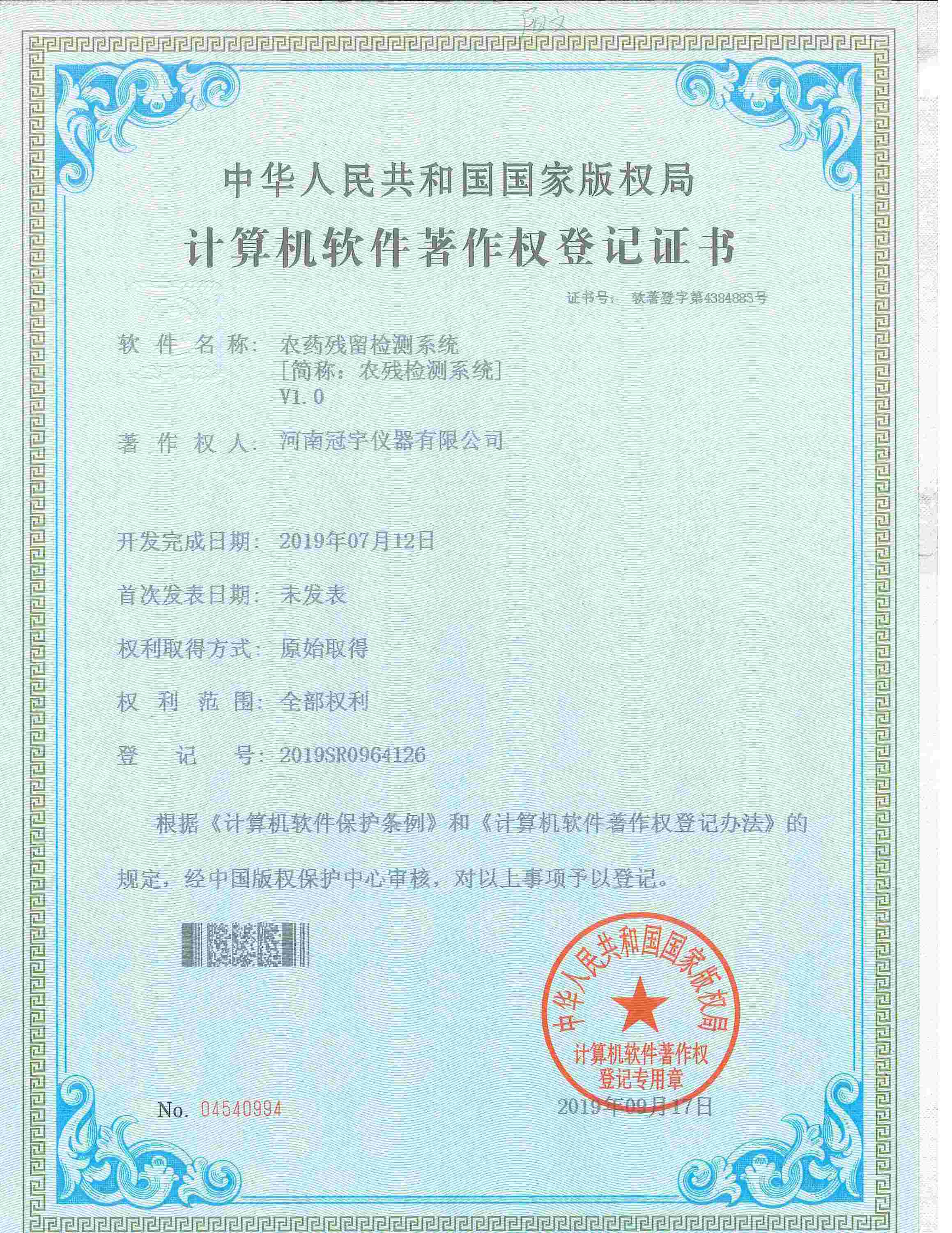 近日,河南冠宇儀器有限公司(以下簡(jiǎn)稱(chēng):冠宇儀器)繼之前的多項(xiàng)軟件著作權(quán)證書(shū)及專(zhuān)利證書(shū)之后,又獲由中華人民共和國(guó)國(guó)家版權(quán)局頒發(fā)的一項(xiàng)“農(nóng)藥殘留檢測(cè)系統(tǒng)計(jì)算機(jī)軟件著作權(quán)登記證書(shū)”,一系列的權(quán)威肯定,彰顯了冠宇儀器強(qiáng)大的技術(shù)研發(fā)能力,也體現(xiàn)出公司為客戶(hù)提供優(yōu)質(zhì)產(chǎn)品的強(qiáng)大決心。