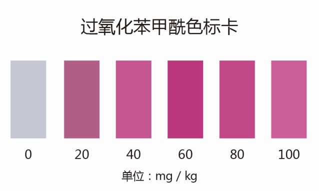 1.3:顯色10min后立即與比色卡對照,找出相應(yīng)的含量。如顏色有變紅則說明可能摻有過氧化苯甲酰,顏色越深,含量越高。