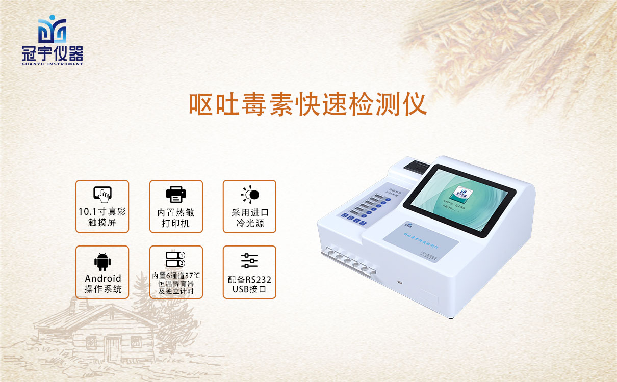 冠宇儀器生產的嘔吐毒素快速測試儀GY-710應用競爭抑制免疫層析的原理,通過檢測線熒光定量卡中的熒光強弱程度,定量分析待檢樣品中嘔吐毒素殘留含量,能夠快速檢測玉米、小麥、大米、大麥、小米和燕麥等谷物、飼料、面粉、食用油、調味品等食品中嘔吐毒素含量,適用于糧油監(jiān)測中心、糧油飼料生產加工、食品加工貿易、畜禽養(yǎng)殖戶自查、工商質監(jiān)部門用于市場快速篩查等。