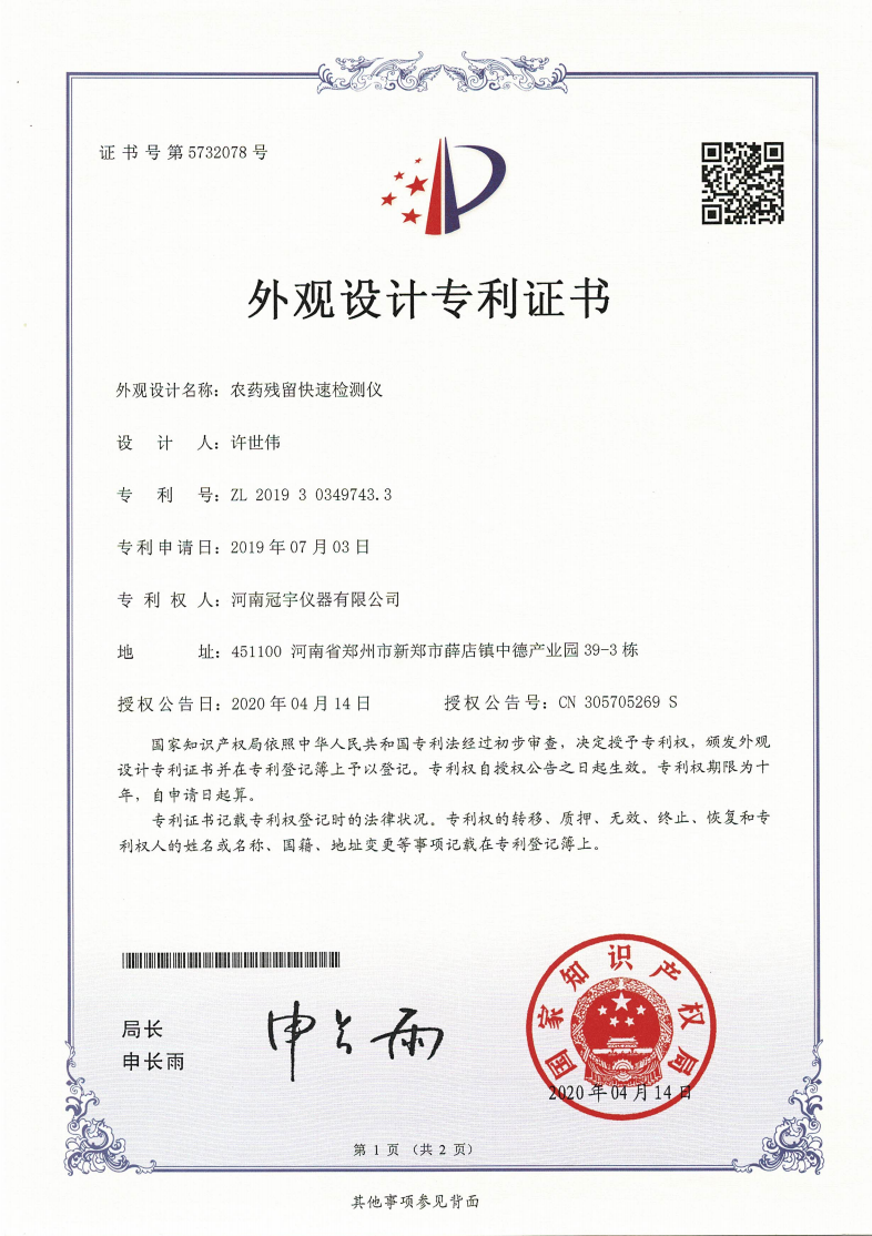 近日,河南冠宇儀器有限公司(以下簡稱:冠宇儀器)繼之前的多項軟件著作權(quán)證書及專利證書之后,又獲由國家知識產(chǎn)權(quán)局頒發(fā)的一項“農(nóng)藥殘留快速檢測儀外觀設計專利證書”,一系列的權(quán)威肯定,彰顯了冠宇儀器強大的技術(shù)研發(fā)能力,也體現(xiàn)出公司為客戶提供優(yōu)質(zhì)產(chǎn)品的強大決心。