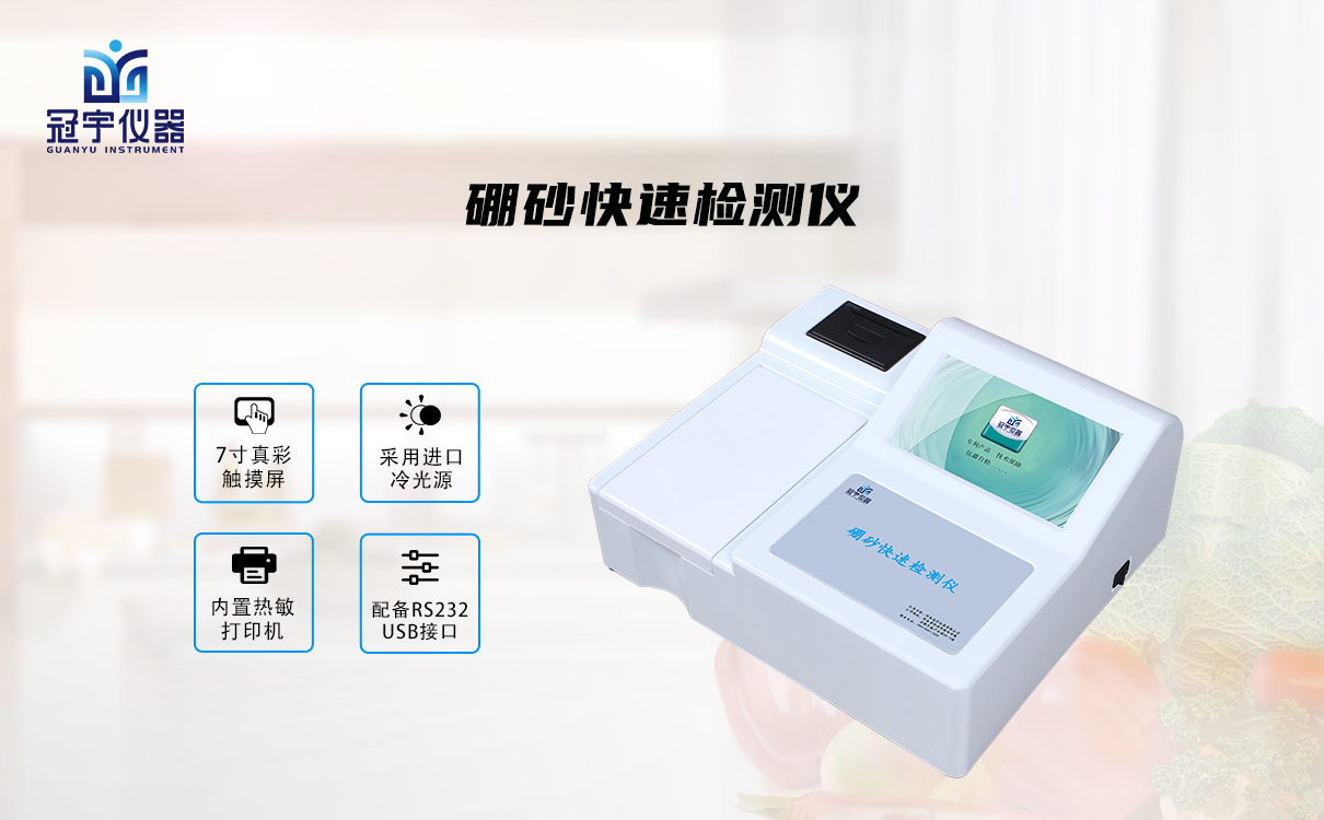 冠宇儀器硼砂檢測(cè)儀GY-1056能夠快速檢測(cè)面條、腐竹、米粉、涼粉、涼皮、面條、餃子皮、餛飩、粽子、肉丸、涼皮、肉制品、乳與乳制品、醬油、人造奶油、葡萄酒等食品中的硼砂含量。