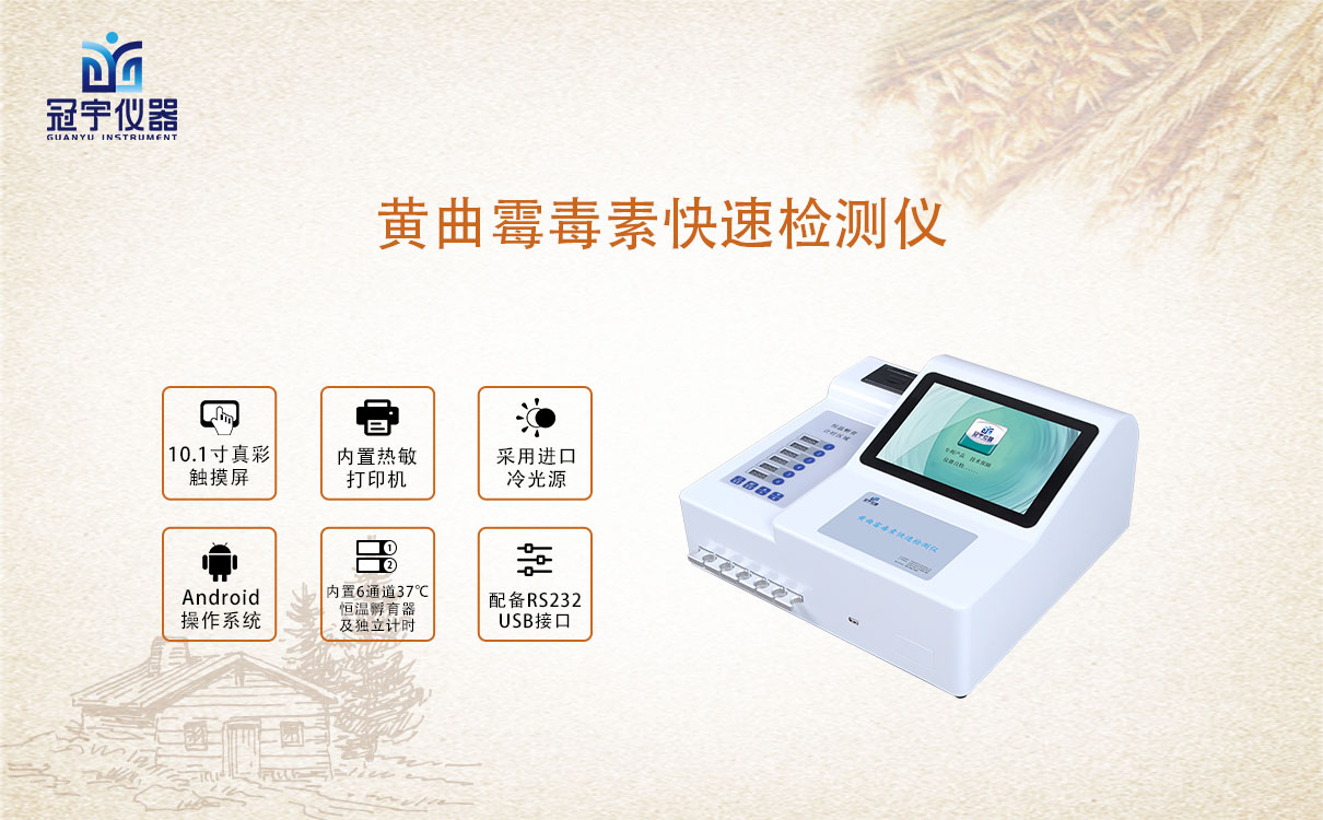 為了保障食品安全,日常監(jiān)管檢測食物中黃曲霉霉毒素是否超標(biāo)這一工作尤為重要和必要。冠宇儀器黃曲霉毒素快速測試儀GY-710通過檢測線熒光定量卡中的熒光強(qiáng)弱程度,定量分析待檢樣品中黃曲霉毒素B1殘留含量;能夠快速定量檢測玉米、小麥、大米、大麥、小米和燕麥等谷物、飼料、面粉、食用油、調(diào)味品中黃曲霉毒素B1,適用于糧庫收糧檢測、糧油監(jiān)測中心、糧油飼料生產(chǎn)加工、食品加工貿(mào)易、畜禽養(yǎng)殖戶自查、工商質(zhì)監(jiān)部門用于市場快速篩查等。