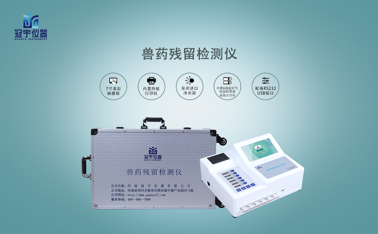 綜上,必須采取有效措施,減少和控制獸藥殘留的發(fā)生。河南冠宇儀器有限公司研制出一款獸藥殘留檢測(cè)儀可現(xiàn)場(chǎng)檢測(cè)食品、肉制品、糧食、化妝品、食用油等樣品中抗生素殘留、毒素、激素及非法添加。如:氯霉素、氰霉素、鹽酸克侖特羅、萊克多巴胺、沙丁胺醇、黃曲霉毒素等數(shù)十種項(xiàng)目。應(yīng)用競(jìng)爭(zhēng)抑制免疫層析的原理,通過檢測(cè)線熒光定量卡中的熒光強(qiáng)弱程度,定量分析待檢樣品中獸藥殘留。廣泛應(yīng)用于食品藥品監(jiān)督管理局,高等院校,科研院所,農(nóng)業(yè)部門,衛(wèi)生部門,屠宰場(chǎng),畜牧獸醫(yī),農(nóng)場(chǎng),食品肉制品深加工企業(yè),檢驗(yàn)檢疫部門。
