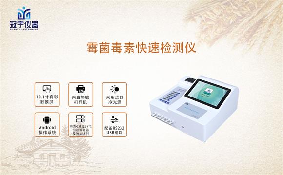 冠宇儀器霉菌毒素檢測(cè)儀應(yīng)用競(jìng)爭(zhēng)抑制免疫層析的原理,通過(guò)檢測(cè)線熒光定量卡中的熒光強(qiáng)弱程度,定量分析待檢樣品中霉菌毒素殘留含量,能夠快速定量檢測(cè)糧食、飼料、谷物、食用油、調(diào)味品等食品中黃曲霉毒素、T2毒素、嘔吐毒素、赭曲霉毒素、伏馬毒素、玉米赤霉烯酮含量。適用于糧油監(jiān)測(cè)中心、糧油飼料生產(chǎn)加工、食品加工貿(mào)易、畜禽養(yǎng)殖戶自查、工商質(zhì)監(jiān)部門用于市場(chǎng)快速篩查等。