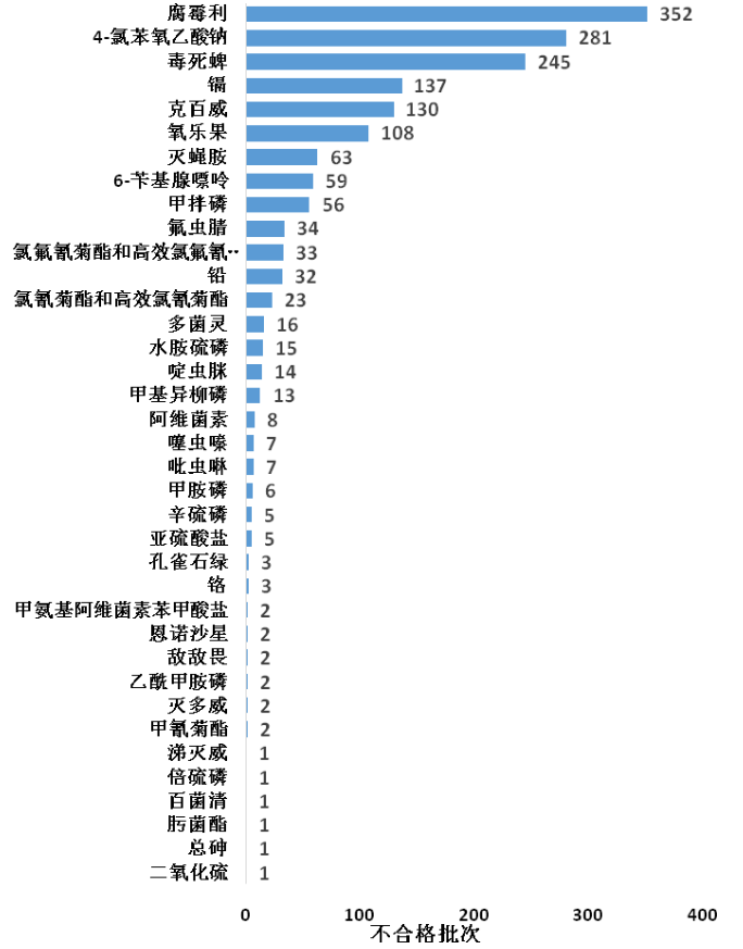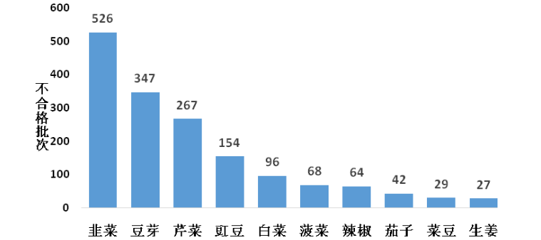 韭菜、豆芽、芹菜為農(nóng)藥殘留超標(biāo)最多的蔬菜產(chǎn)品。其中526批次韭菜檢出有農(nóng)藥殘留超標(biāo),其中腐霉利殘留超標(biāo)352批次、鎘被檢出70批次;347批次豆芽檢出農(nóng)藥殘留超標(biāo),其中4-氯苯氧乙酸鈉殘留超標(biāo)280批次、6-芐基腺嘌呤殘留超標(biāo)59批次;267批次芹菜檢出農(nóng)藥殘留超標(biāo),其中毒死蜱被檢出146批次、甲拌磷被檢出42批次。另外,抽檢不合格頻次較多的蔬菜還有豇豆和白菜,豇豆中克百威被檢出52批次,滅蠅胺被檢出51批次,白菜中毒死蜱被檢出45批次(詳見圖2)。