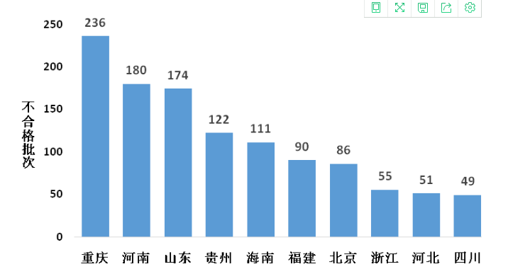 重慶市、河南省、山東省為蔬菜產(chǎn)品抽檢不合格最多的銷售地。重慶市抽檢不合格236批次,其中韭菜70批次、芹菜39批次;河南省抽檢不合格180批次,其中韭菜82批次、豆芽47批次;山東省抽檢不合格174批次,其中韭菜72批次、豆芽52批次(詳見圖3)。
