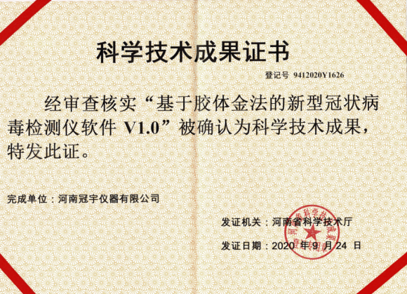 河南冠宇儀器有限公司(以下簡(jiǎn)稱:冠宇儀器)繼多項(xiàng)軟件著作權(quán)證書、實(shí)用新型專利證書、計(jì)算機(jī)軟件著作權(quán)等一系列證書之后,又獲由河南省科學(xué)技術(shù)廳頒發(fā)的一項(xiàng)“基于膠體金法的新型冠狀病毒檢測(cè)儀軟件V1.0科學(xué)技術(shù)成果證書”,一系列的權(quán)威肯定,彰顯了冠宇儀器強(qiáng)大的技術(shù)研發(fā)能力,也體現(xiàn)出公司為客戶提供優(yōu)質(zhì)產(chǎn)品的強(qiáng)大決心。