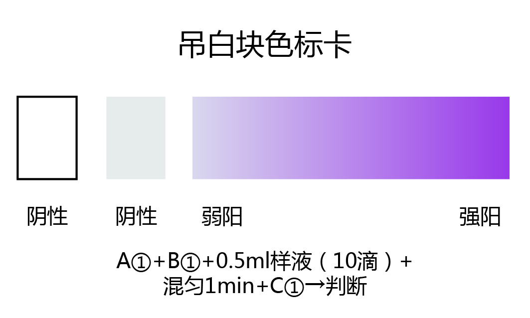 2.2:若反應結果溶液呈明顯的紫色,表示被檢樣品浸泡過吊白塊,其顏色越深表示吊白塊含量越高。(詳見色卡)