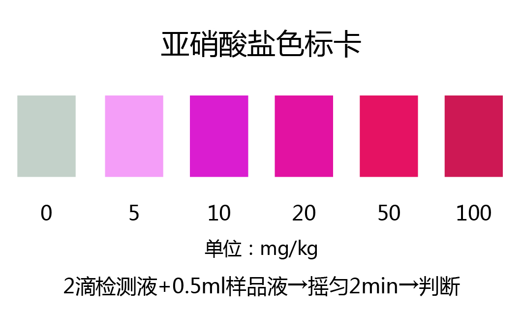 2.1:2分鐘后觀察檢測管中顏色的深淺,紫紅色顏色越深,表示樣品中亞硝酸鹽的含量越高。