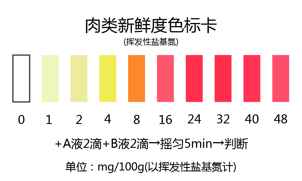 比色卡為每100g肉品中揮發(fā)性鹽基氮的大致含量,可根據(jù)下列指標(biāo)確定肉品的新鮮度: