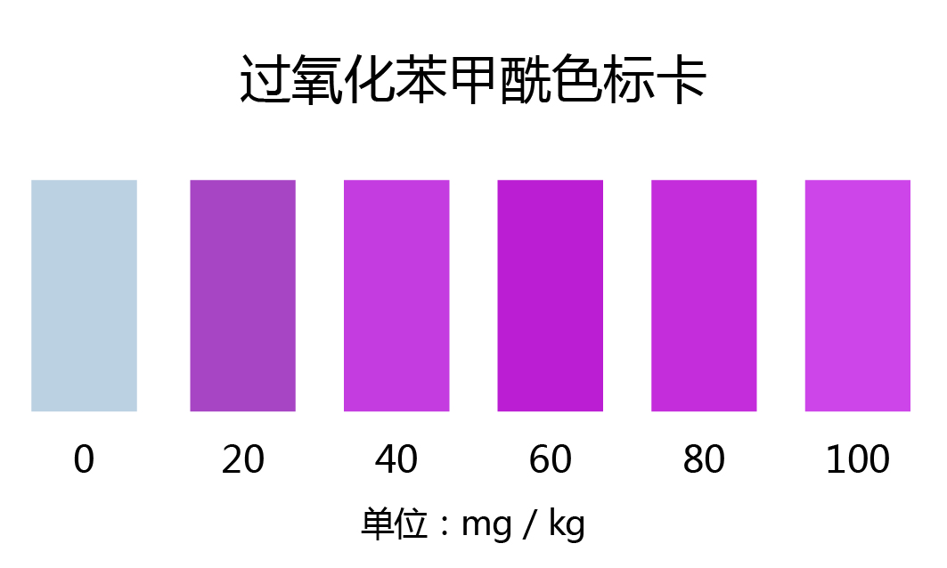 1.3:顯色10min后立即與比色卡對照,找出相應(yīng)的含量。如顏色有變紅則說明可能摻有過氧化苯甲酰,顏色越深,含量越高。