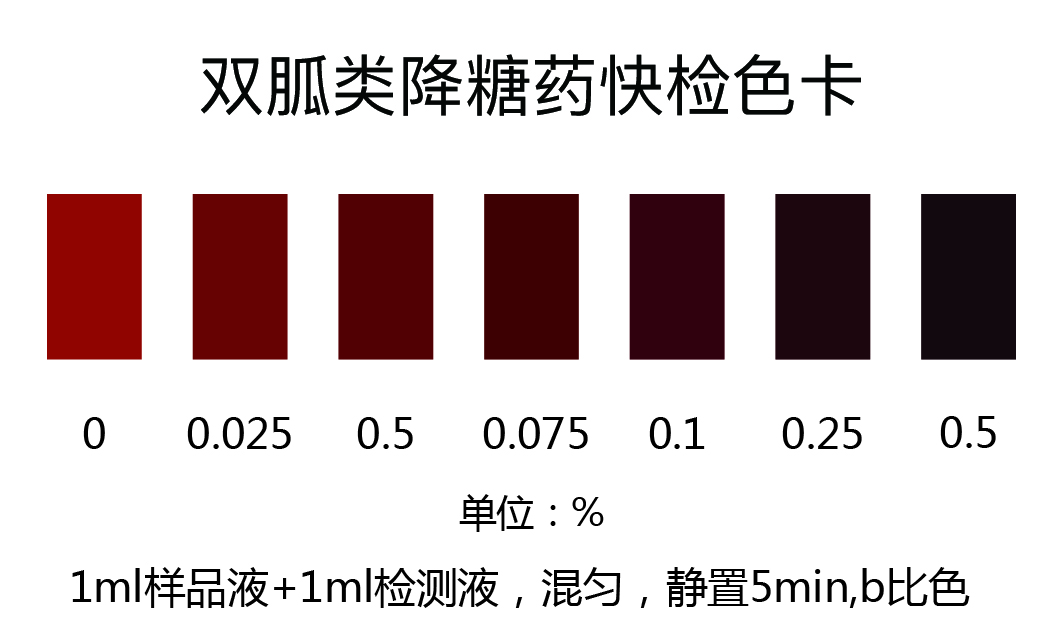 取上述濾液0.5 ml于玻璃比色皿或試管中,加入5滴檢測液,振蕩混勻,靜置5min,對(duì)照色卡比色,雙胍類降糖藥含量越高,顏色越深;