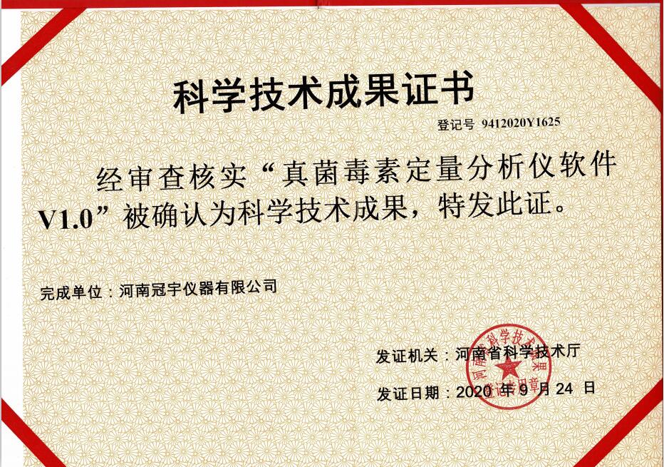 河南冠宇儀器有限公司(以下簡(jiǎn)稱:冠宇儀器)繼多項(xiàng)軟件著作權(quán)證書、實(shí)用新型專利證書、計(jì)算機(jī)軟件著作權(quán)等一系列證書之后,又獲由河南省科學(xué)技術(shù)廳頒發(fā)的一項(xiàng)“真菌毒素定量分析儀軟件V1.0科學(xué)技術(shù)成果證書”,一系列的權(quán)威肯定,彰顯了冠宇儀器強(qiáng)大的技術(shù)研發(fā)能力,也體現(xiàn)出公司為客戶提供優(yōu)質(zhì)產(chǎn)品的強(qiáng)大決心。